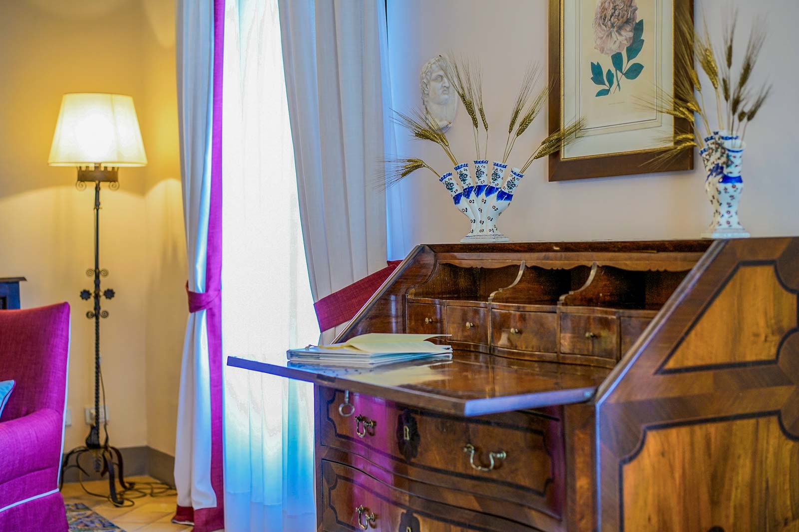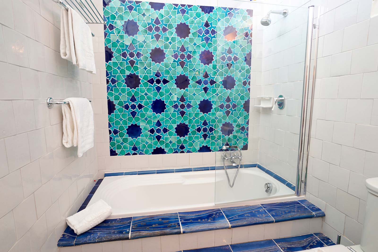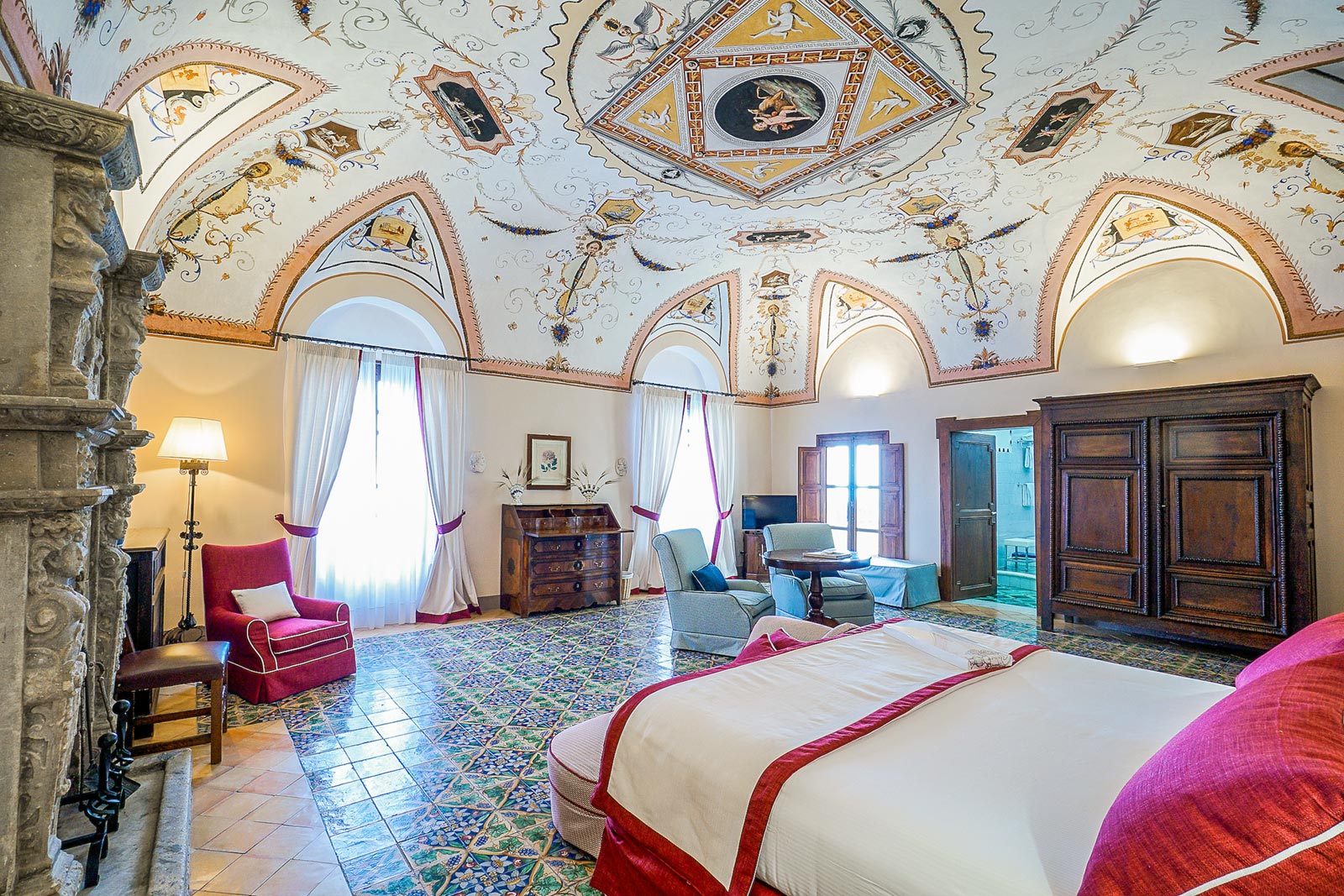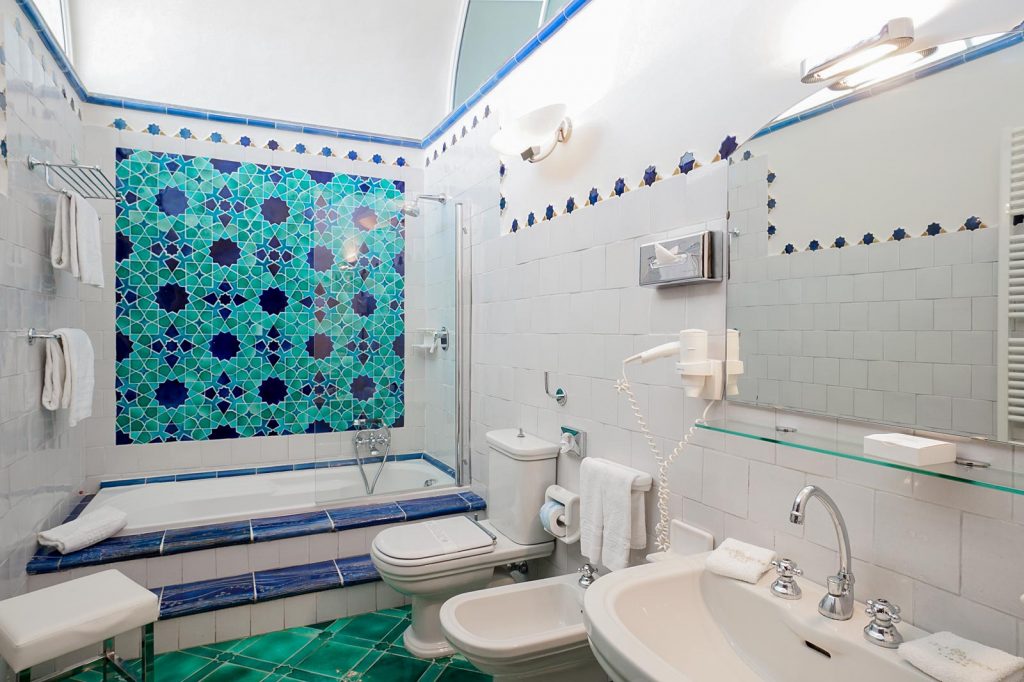 L’emozionante E.W.B. SUITE è percorsa per intero dall’ampio soffitto a volte affrescate ed ha un antico e grande camino in pietra con raffigurazioni a rilievo nella sua parte centrale; elementi essenziali che donano all’ambiente un’atmosfera unica ed irripetibile. Rare ed esclusive le piastrelle del pavimento in cotto decorato, realizzate a mano dagli artigiani vietresi nei primi anni del ‘900. Dal terrazzo-veranda si gode un’incantevole vista sul mare di Amalfi. Maioliche con disegni arabeggianti, in tonalità blu e verde ramina, si ritrovano nel moderno bagno (con vasca e doccia) a rievocare gli antichi influssi orientali sulla Costiera.